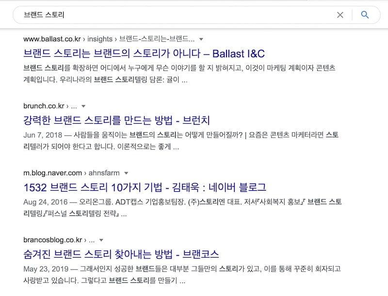 추가 설명: 이 글을 작성했던 때에는 브랜드 스토리에 대해 검색해보는 사람들이 궁금한 것과 동떨어진 내용들이 많았지만, 현재 구글 검색 상위 결과들이 많이 달라졌습니다. 그리고 현재 보고 계신 이 글이 검색 결과 1위입니다.
